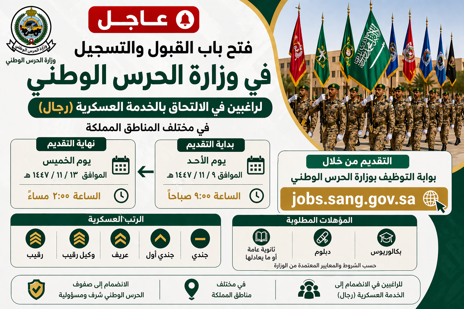 وأوضحت وزارة الحرس الوطني أن التقديم يتم بشكل إلكتروني من خلال بوابة التوظيف الرسمية الخاصة بالوزارة، حيث يمكن للراغبين في التسجيل الدخول عبر الرابط المخصص واستكمال إجراءات التقديم خلال الفترة المحددة.